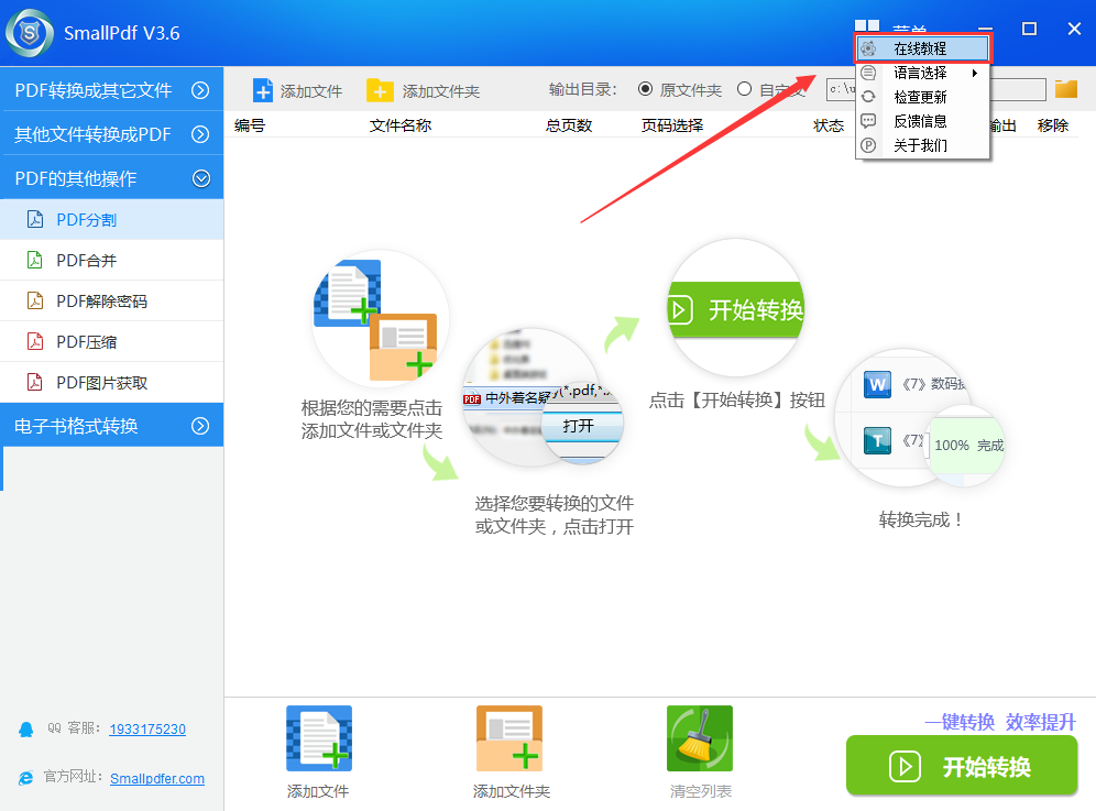3、点开“菜单”后我们点击下方的“在线教程”进入我们的smallpdf转换器使用教学。